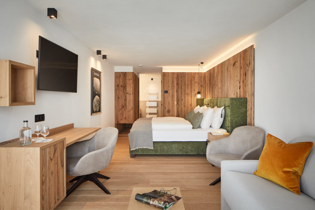 The Ammonit premium double elegant and trendy with elements from the area like the wood on the floor or the stone used in the bathroom. It has a contemporary mountain style that I truly love.